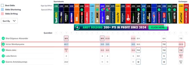 除此之外,文班亞馬的MVP賠率也僅次於亞曆山大排在第二的位置,雷霆、馬刺目前都是三連勝,馬刺衝到西部第二這你敢相信嗎?