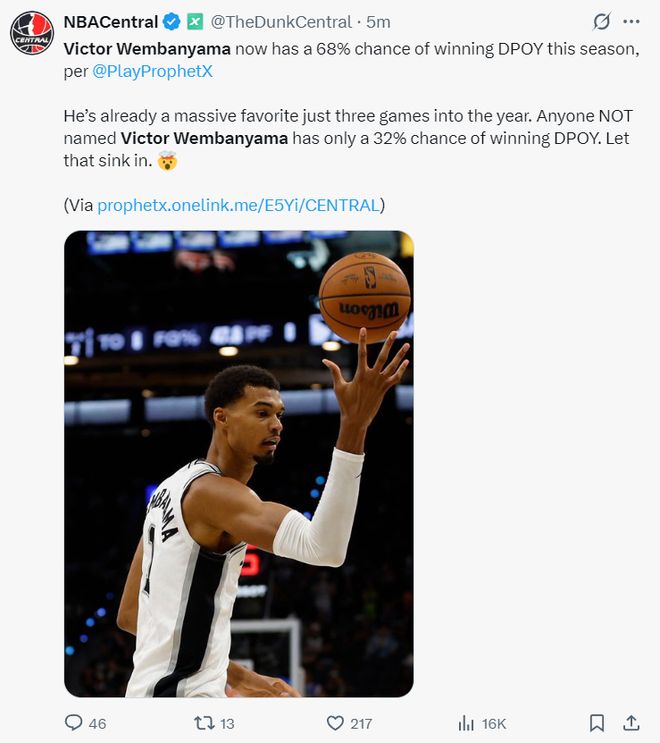 根據數據媒體PlayProphetX的數據預測,文班亞馬本賽季獲得DPOY(最佳防守球員)的概率已經達到68%,他僅僅出戰三場比賽就成為DPOY的第一熱門人選,其他人合計隻有32%的概率。