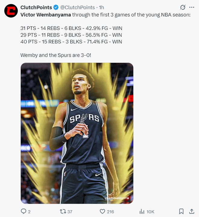 開賽季的三場比賽文班亞馬分別拿到31+14+6帽、29+11+9帽、40+15+3帽,場均32.7分鍾,拿到33.3分13.3籃板2.3助攻1.7搶斷6蓋帽,命中率59.6%,三分命中率36.4%,最關鍵的本賽季文班亞馬場均僅0.7次失誤。