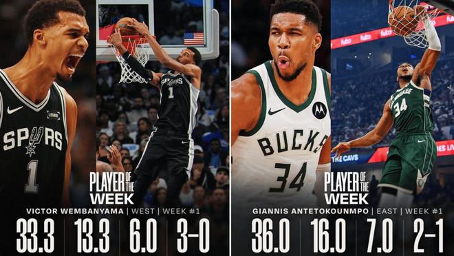 此外,NBA官方公布了第一期周最佳球員,分別是西部馬刺隊的維克托-文班亞馬和東部雄鹿隊的揚尼斯-阿德托昆博。其中,文班亞馬場均得到33.3分13.3籃板6封蓋,率領馬刺取得3勝0負,阿德托昆博場均36分16籃板7助攻,率領雄鹿2勝1負。這個周最佳頒發得一點毛病都沒有,文班亞馬這是他第二次榮獲周最佳球員,本賽季,肉眼可見的文班亞馬超級進化,主要體現在進攻手段,以及對抗能力上,休賽期增肌的效果立竿見影,以文班亞馬的身高,加上後衛般的進攻技巧和協調性,你可以在場上看見他做出各種匪夷所思的得分終結,根本沒在其他球員身上見過。