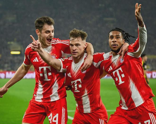 終場哨響,基米希被隊友高高舉起,凱恩笑著與穆西亞拉擁抱。而另一邊,多特隊長埃姆雷·詹因傷被換下,眼神中充滿了不甘。